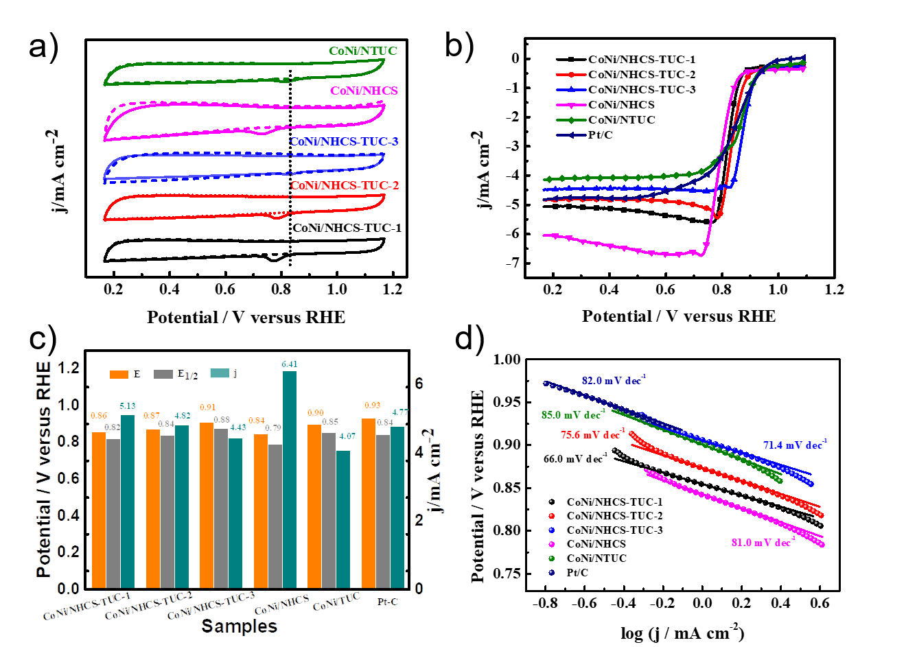得益于丰富的Co-Ni/N 耦合中心、具有更多暴露活性位点的高表面积以及易于气体扩散和传质的中空结构的协同作用,制备的材料展现出优异的性能。当CoNi/NTUC 的量增加时,活性位点数量增加,导致ORR 电位正移。然而,CoNi/NTUC的增加可能导致空心球坍塌和管缠结的可能性,从而导致气体扩散和传质困难,从而使电流变小。活性物质的数量和空间密度之间的适当平衡使得CoNi/NHCS-TUC-3 具有最佳的活性材料利用效率,从而导致其最佳的电催化性能。不同比例的球状碳和管状碳的材料表现出有趣的双功能性能:具有丰富管状含量的样品具有最高的ORR 起始电位(0.91 V vs RHE),而富含球状碳的材料具有最高的ORR 起始电位含量最高的ORR 电流密度(5.13 mA·cm-2)。此外,CoNi/NHCS-TUC-3 提供了0.806 V 的最低电位差(ΔE="Ej="10 - E1/2)。随后测试了CoNi/NHCS-TUC-3 作为空气电极的一次和可充电锌空气电池的潜在可能性。原电池的开路电位为1.59 V,峰值功率密度为361.8 mA·cm-2,比容量为756.5 mAh·gZn-1。可充电电池在10 mA·cm-2下可稳定循环55 h以上。