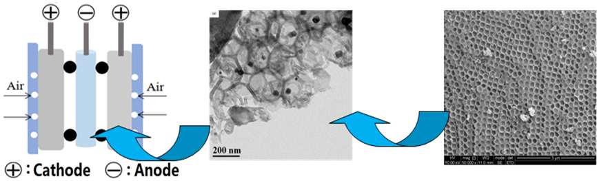 近日,betway88西汉姆联的易清风教授课题组报道了一种非贵金属的Ni-Co-N掺杂蜂窝碳纳米复合材料作为无膜直接醇燃料电池的阴极催化剂。该工作首先通过简单的PMMA模板法制备具有正六边形结构的蜂窝状碳,然后通过热解由蜂窝碳(HC),双氰胺和钴/镍盐组成的混合物,制备了NiCo掺杂的HC和C-N纳米空心管复合材料。以这种复合材料作为空气电极催化剂、碳纳米管负载的三元PdAgSn作为阳极催化剂,以乙醇,正丙醇和异丙醇为燃料,组装了无膜直接醇燃料电池。研究结果表明该阴极催化剂在碱性环境下具有优异的抗醇性,所组装的无膜直接醇燃料电池能以较长时间稳定放电。