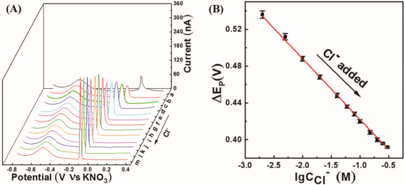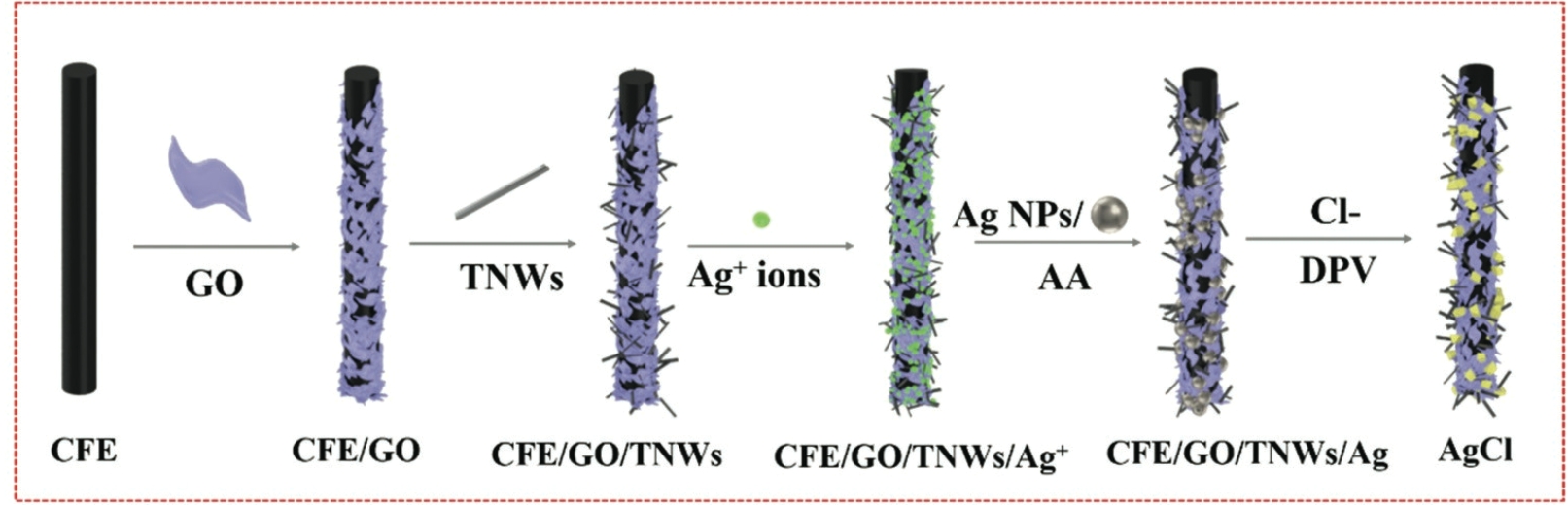 为此,我们采用钛酸盐纳米线(TNWs)作为吸附剂吸附Ag+离子,再加入抗坏血酸原位还原表面Ag+离子以形成均匀的纳米Ag NPs作为Cl−识别元素,同时在TNWs上吸附亚甲基蓝(MB)作为内置校正信号单元,以碳纤维丝微电极为基底电极构建了高性能的Cl−电化学微传感器。
