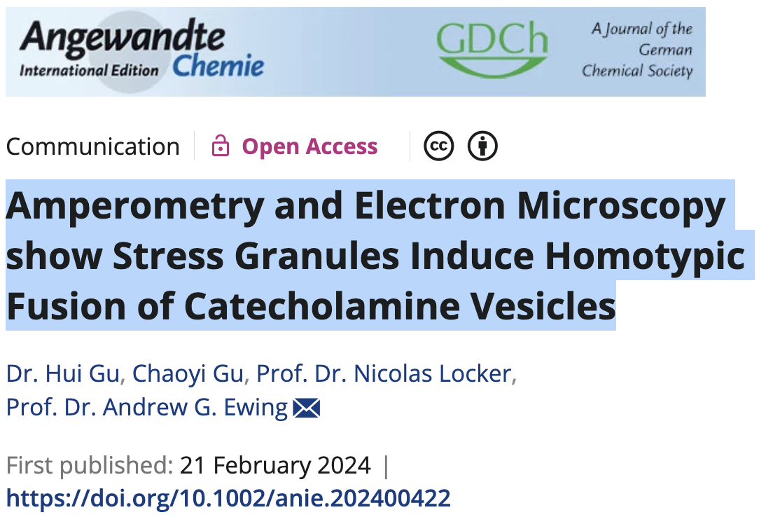 近日,公司betway88西汉姆联教师谷慧副教授发现应激颗粒可促进同型囊泡融合。该研究成果以“Amperometry and Electron Microscopy show Stress Granules Induce Homotypic Fusion of Catecholamine Vesicles”为题发表在国际顶级期刊《Angew. Chem. Int. Ed.》上,该期刊为化学领域的经典Top期刊(影响因子:16.6)。该研究工作主要由谷慧副教授(第一作者)和哥德堡大学合作导师Andrew Ewing(通讯作者)共同完成,betway88西汉姆联为第一单位。
