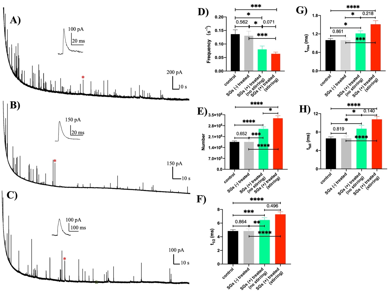 囊泡冲击电化学细胞术结果(图 1A-C)显示,与对照组相比,用SG 处理囊泡并每6 分钟通过吸管搅拌一次后,囊泡打开事件的频率显著降低(图 1D),这种差异似乎归因于SG 和囊泡碰撞所驱动的效应。在SG 处理组和对照组之间,SG处理使囊泡含量显著增加(图1E),且囊泡打开的动力学减慢(图1F-H),这可能是由于附着在囊泡膜上,增加了膜的粘度并减慢了静电能量耗散。