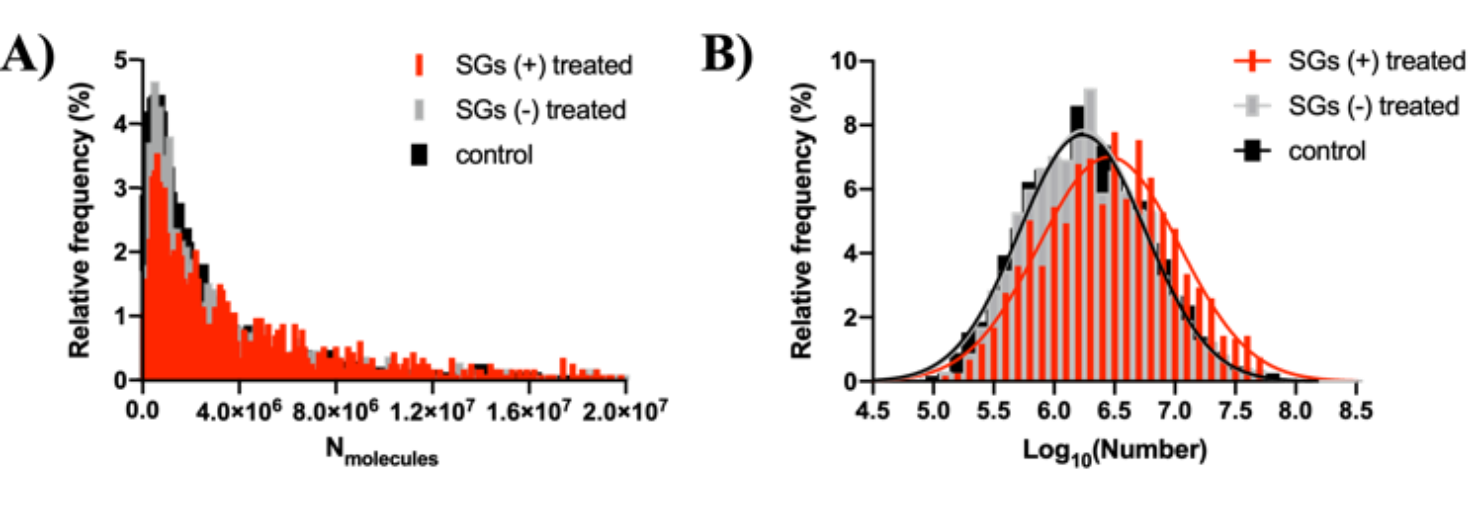 为了弄清楚囊泡内分子数量增加的原因,我们专门分析了囊泡打开所有事件的分子数分布(图2 )证实SG孵育后,形成了部分较大尺寸的囊泡。