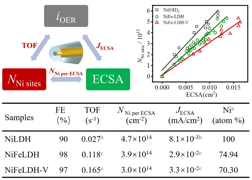 本工作聚焦于OER本征活性的评价方法,以镍铁层状氢氧化物(NiFe-LDH)为模型体系,通过积分循环伏安法中Ni3+/Ni2+还原峰电流获得了Ni位点数(N Ni-sites),并将其与OER电流相关联,获得了与负载量无关的本征活性(TOF)。通过交流阻抗技术测量了氧化态催化剂的双电层电容(Cdl)和电化学活性面积(ECSA),并将其与N Ni-sites和OER电流相关联,得到单位电化学活性面积的Ni位点数(N Ni-per-ECSA)和OER电流密度(JECSA)。通过Ni(OH)2、NiFe-LDH和NiFe-LDH-V的本征活性参数TOF,N Ni-per-ECSA和JECSA的比较,表明Fe位点和Ni空位的引入提高了TOF和JECSA,但降低了N Ni-per-ECSA。因此,提高电催化活性的最佳方法是提高TOF的同时增加单位面积的活性位点数。该工作为催化剂本征活性的合理评价和高效筛选提供了新方法。