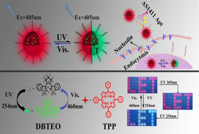 由于复杂的内部环境,在荧光成像中,细胞内的一些大分子如荧光蛋白等产生的荧光信号易干扰成像效果,甚至产生假阳性。光开关荧光聚合物纳米粒子,可在光的作用下相互转换其分子结构,可逆地转换荧光发射,为细胞成像的抗背景研究,提供了有力工具。基于此,发展了一种具有完全零串扰的特定颜色的光开光双色荧光聚合物纳米粒子。该纳米粒子通过结合光开关荧光分子二芳基乙烯和具有较大斯托克斯位移的红色荧光染料四苯基卟啉(TPP)到PMMA纳米颗粒中。通过合理的比例设计,该纳米粒子显示出高的荧光对比度,零串扰双色荧光特性,以及不同的光开关荧光信号。实验结果表明,将核酸适配体AS1411交联到纳米探针表面后,可实现靶向癌细胞的光开关双色成像。此外,我们还将该纳米粒子应用于信息加密、防伪及可擦写荧光图案。该工作成果发表在Dyes and Pigments上(SCI一区,IF4.889),于2021年4月在线发表。湘潭大学-betway88西汉姆联联合培养硕士刘乐为本文第一作者,公司张崇华博士、陈建教授和湘潭大学高勇教授为共同通讯作者,betway88西汉姆联为第一单位。