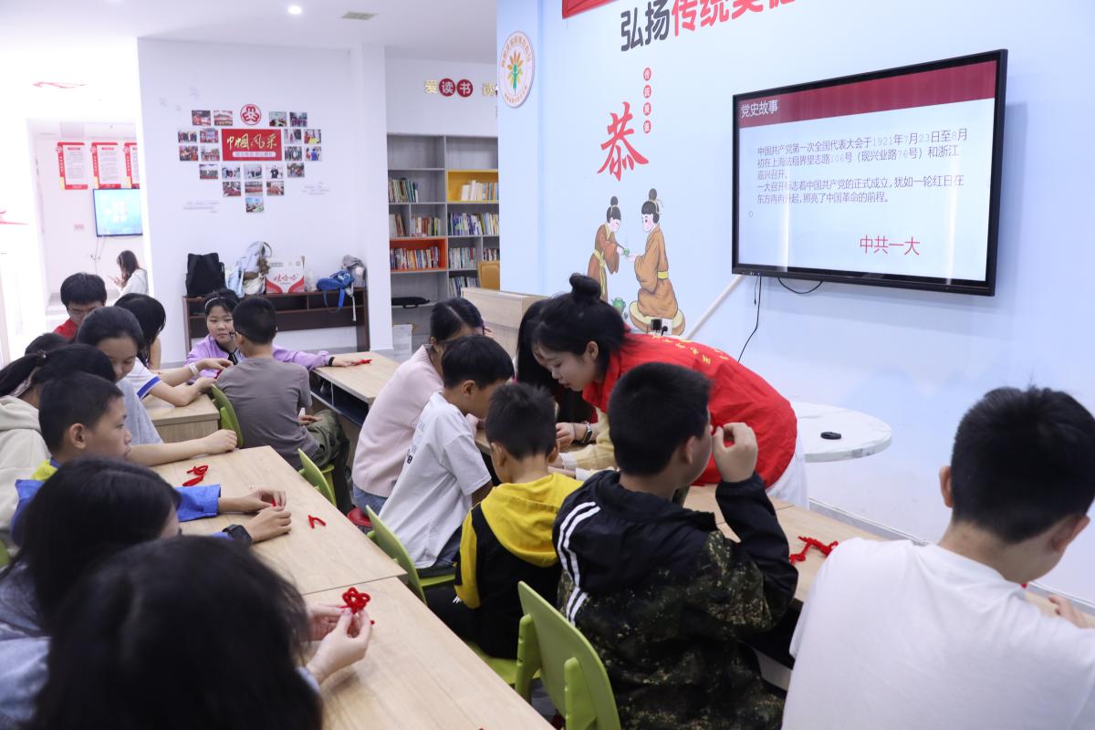 活动现场,员工党员肖雯首先通过生动的视频向小朋友们展示了中国结的历史渊源,详细介绍了多种中国结及其蕴含的美好寓意。接着,她提出了几个问题:“大家知道少先队的全称是什么吗?”“红领巾为什么是红色的呢?”通过这些问题,她巧妙地联系起小朋友们熟悉的少先队和红领巾解读了中国结的红色密码,郑重介绍了党的诞生和中共一大召开的重要党史,落实了党史教育实践目标。