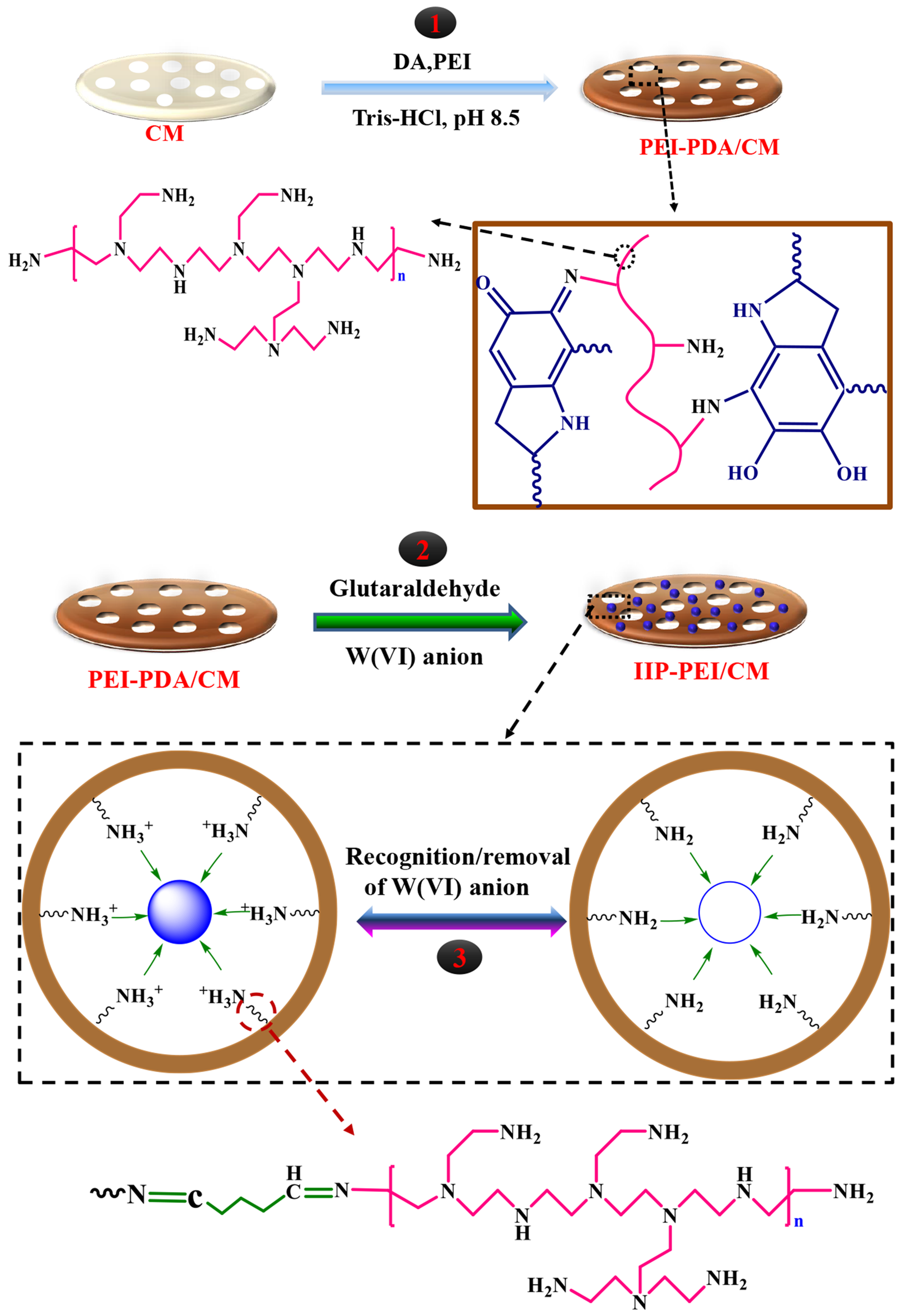 近期,betway88西汉姆联曾坚贤教授课题组报道了采用三氧化二铝陶瓷膜为载体,以W(VI)或Mo(VI)为模板离子,多巴胺/聚乙烯亚胺共沉积或1-乙烯基咪唑为功能单体,戊二醛或1,6-二溴己烷为交联剂,CuSO4/H2O2为催化剂,采用表面印迹和接枝聚合方法,成功制备了能选择性分离W(VI)或Mo(VI)的新型印迹陶瓷膜。该印迹陶瓷膜对W(VI)或Mo(VI)具有较大的吸附容量,较高的选择性分离系数,较快的吸附动力学,且再生和循环使用性能良好。该工作探索了印迹聚合物高效选择性和陶瓷膜优异分离性能的结合行为,为复合陶瓷膜选择性分离金属离子提供了新思路。