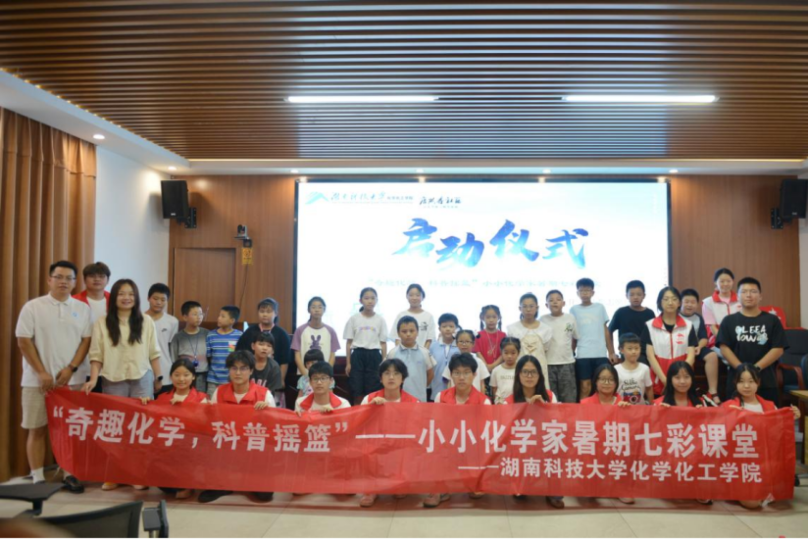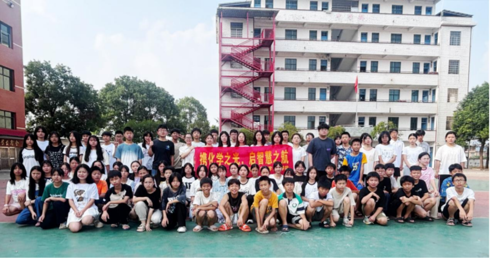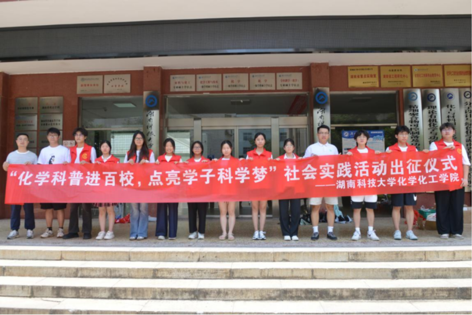 仪式在化学楼前举行,公司领导、师生代表齐聚,为即将奔赴基层的实践队员壮行。伴随着队旗挥舞与青春誓言,两支科普服务队正式启程,分赴衡阳市祁东县与湘潭市雨湖区,开展为期数日的科普实践。