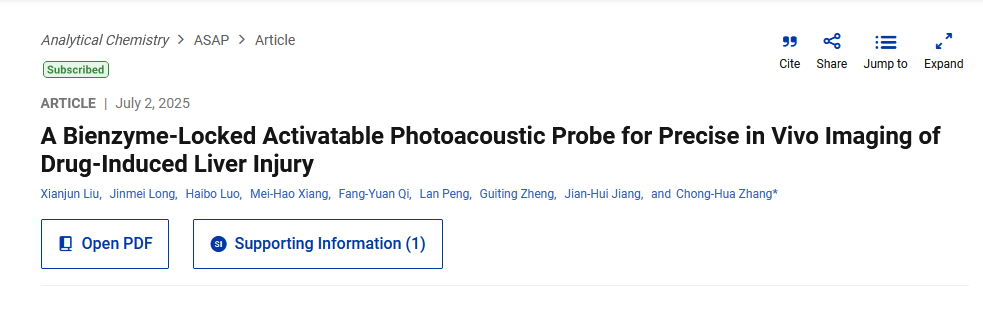 近日,公司教师刘贤军副研究员,张崇华副教授开发了一种新型双酶型可激活式光声探针用于药物性肝损伤的精准活体成像。该研究成果以“A Bienzyme-Locked Activatable Photoacoustic Probe for Precise In Vivo Imaging of Drug-Induced Liver Injury”为题发表在国际顶级期刊《Analytical Chemistry》上,该期刊为分析化学领域的经典Top期刊。该研究工作主要由刘贤军博士(第一作者)和张崇华副教授(通讯作者)共同完成,betway88西汉姆联为第一单位。