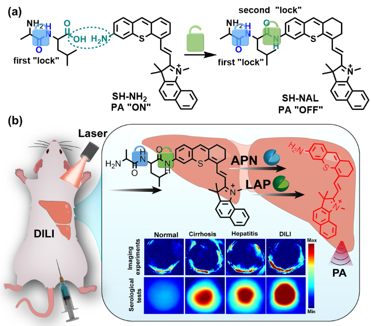 图1.(a) 双酶锁型可激活式光声探针(SH-NAL)的设计策略;(b) SH-NAL用于活体及血清中DILI的成像检测示意图。