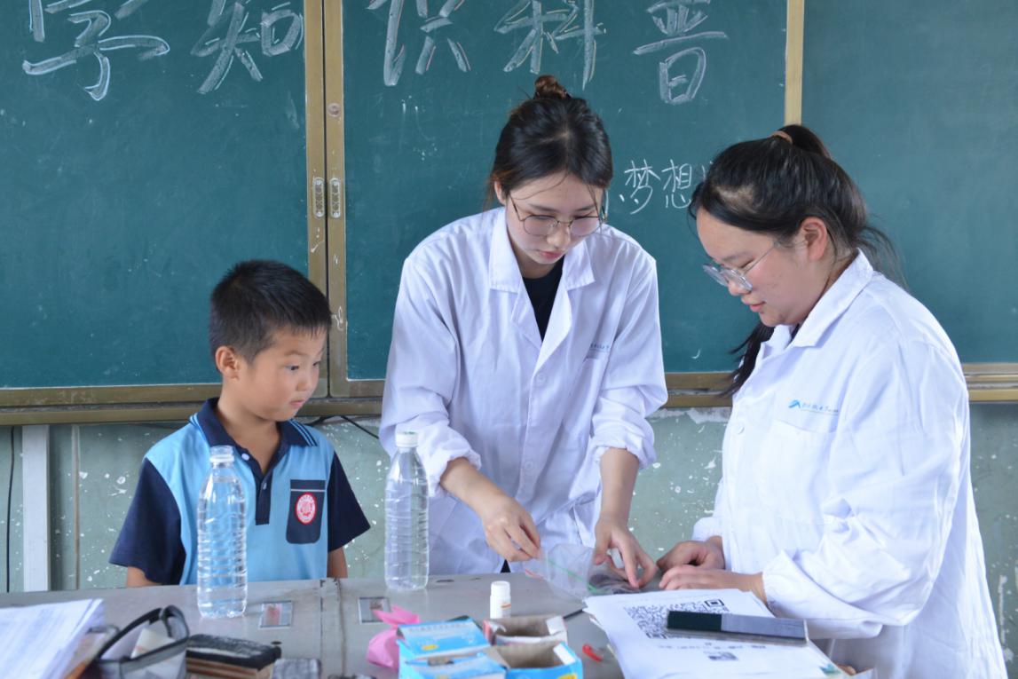 在科普课堂上,“小小梦想家”实践团的成员们化身科学魔法师,将高锰酸钾溶液与维生素C巧妙结合,让孩子们亲眼见证了色彩消失的奇迹。水瓶摇晃下,溶液的紫红色瞬间消失,如同魔法般令人惊叹。