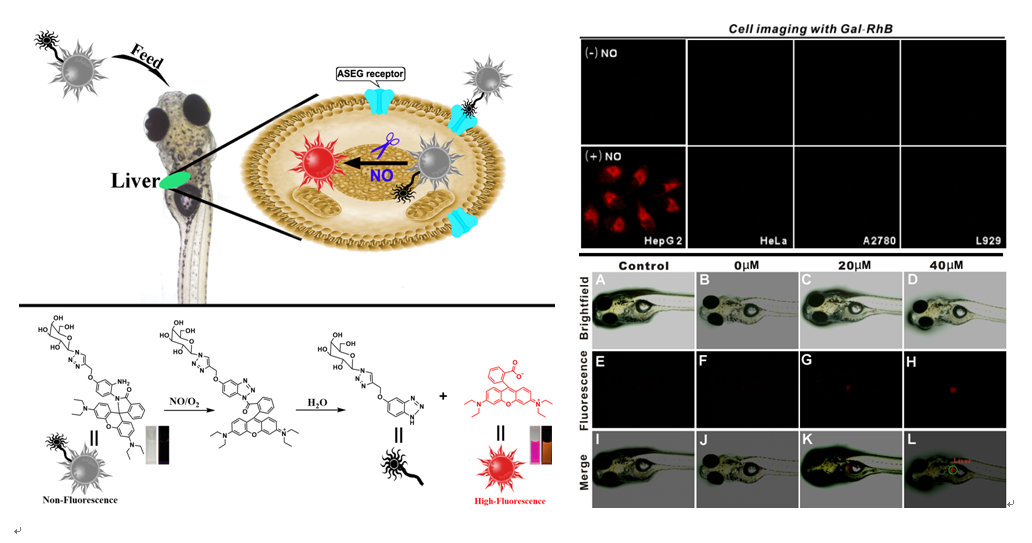 近日,betway88西汉姆联理论有机化学与功能分子教育部重点实验室的张培盛博士研究团队首次报道了一种肝靶向NO荧光探针(Gal-RhB),实现了斑马鱼内肝脏中NO的原位成像检测。Gal-RhB以市售罗丹明B为母体结构,通过将邻苯二胺(NO识别基团)和半乳糖(肝靶向基团)引入罗丹明B结构中,构建了肝靶向NO荧光探针(Gal-RhB)。半乳糖基团的引入不仅增加了探针的水溶性,也有利于探针被肝细胞特异性摄取。细胞和活体成像研究表明:该荧光探针(Gal-RhB)能够被肝细胞特异性摄取,并应用于肝细胞和肝脏中NO的荧光成像分析。该研究对进一步了解NO与肝脏相关疾病的发生发展作用研究具有重要的意义。